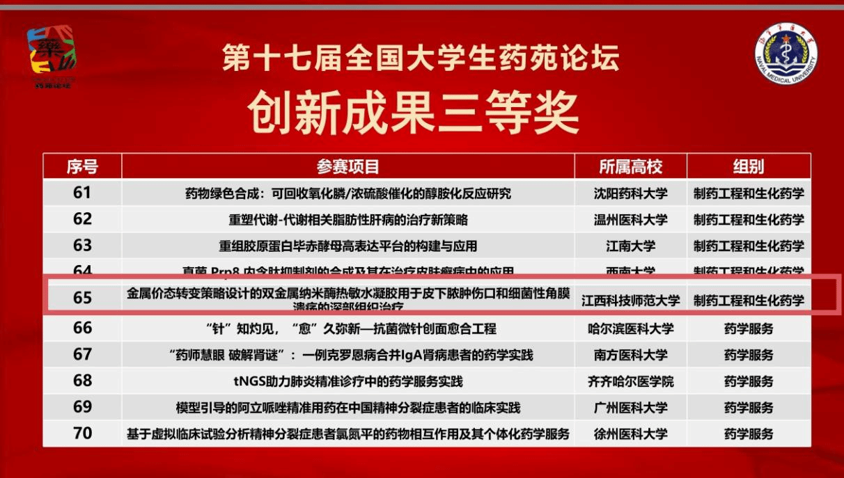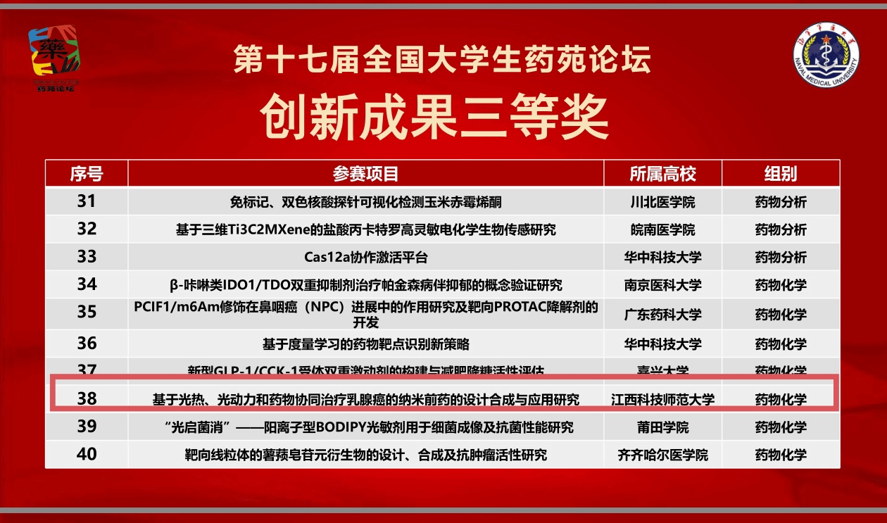 本届论坛由全国药学类院校大学生专业技术与实验技能竞赛组委会主办、中国人民解放军海军军医大学承办,设“药学科学”与“药学服务”两个赛道,共吸引全国各地126所高校代表队参加,参赛规模创历史新高。我校药学院、药物分子设计与评价省重点实验室两个项目荣获“创新成果全国三等奖”,其中《基于光热、光动力和药物协同治疗乳腺癌的纳米前药的设计合成与应用研究》项目由周莹怡等同学完成,乔丹、张瑾征老师指导,该研究融合三重治疗机制,为乳腺癌精准治疗提供新思路;《金属价态转变策略设计的双金属纳米酶热敏水凝胶用于深部组织感染治疗》项目由李娴晰、潘杰仪、李仁熙等同学完成,聂存鹏、潘青山、徐珊老师指导,该研究成果有望应用于皮下脓肿、细菌性角膜溃疡等难治性感染治疗。两项成果充分展现了我校药学专业学生扎实的科研素养与创新能力,彰显了团队面向临床需求、服务健康中国的责任担当。