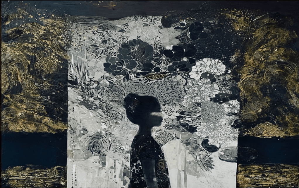 姚爱美老师作品《流逝》以西方构成语言解构东方元素,以沉稳雅致的黑白灰与金色碰撞,以极繁背景与逆光人物的强烈对比,传达出作者对时间、空间的独特感知,展现出文化自信的当代表达。