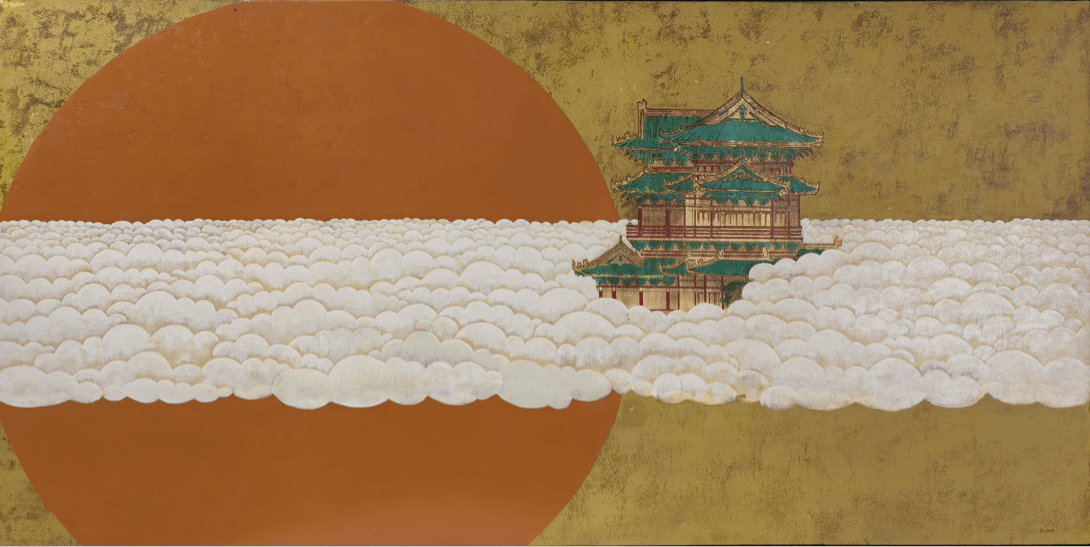 秦鹏老师作品《层峦耸翠上出重霄》以唐代文学家王勃《滕王阁序》中“层峦耸翠,上出重霄”的经典诗句为创作立意,巧妙融合大漆、金箔、木粉等漆画特色材料,画面中金色云海与朱红圆日相映,滕王阁层楼叠翠、凌空欲出,将文学文本中的壮阔意境转化为浪漫的可视化艺术语言。
