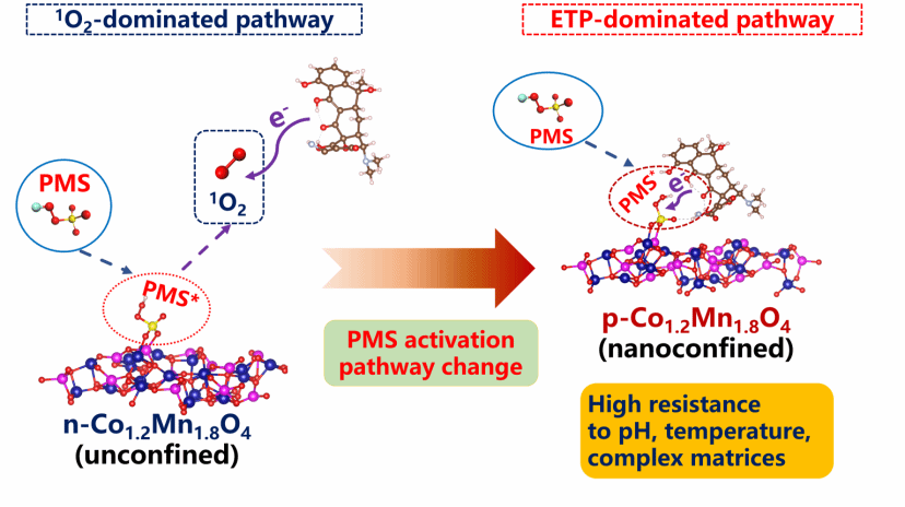 抗生素是目前自然水体中常见的难降解污染物,对水体环境安全造成重大挑战。过一硫酸盐(PMS)活化技术能有效氧化降解抗生素污染物,但其降解效能易受自然水体中无机盐离子及溶解性有机物影响。为改善这一缺陷,本研究通过热解Co-Mn普鲁士蓝类似物(PBA)前驱体,成功构建了一种兼具双金属活性位点与介孔纳米限域结构的多孔Co–Mn双金属氧化物(p-Co₁.₂Mn₁.₈O₄)。该材料在活化过一硫酸盐(PMS)降解难降解有机污染物中展现出卓越性能:在15分钟内实现近100%的抗生素去除,表观一级反应速率常数高达0.348 min⁻¹。机理研究表明,p-Co₁.₂Mn₁.₈O₄通过纳米限域效应富集界面污染物浓度,并利用Co–Mn异质双金属位点强化PMS吸附与活化,协同驱动反应路径由传统活性氧(如¹O₂)主导的自由基机制向非自由基直接电子转移路径(ETP)转变。该ETP过程以表面吸附的PMS*络合物为电子受体、TC为电子供体,具有抗复杂水质干扰、宽pH适应性及对富电子污染物高选择性的优势。DFT计算与FEM模拟进一步证实,Co–Mn桥位点显著增强PMS吸附能,而介孔结构可将局部污染物浓度提升5–6倍。在连续流固定床反应器中,该体系对真实制药废水仍保持>76%的COD去除率,且金属溶出极低,展现出良好的实际应用潜力。本工作为设计高效、稳定、抗干扰的PMS活化催化剂提供了新思路。