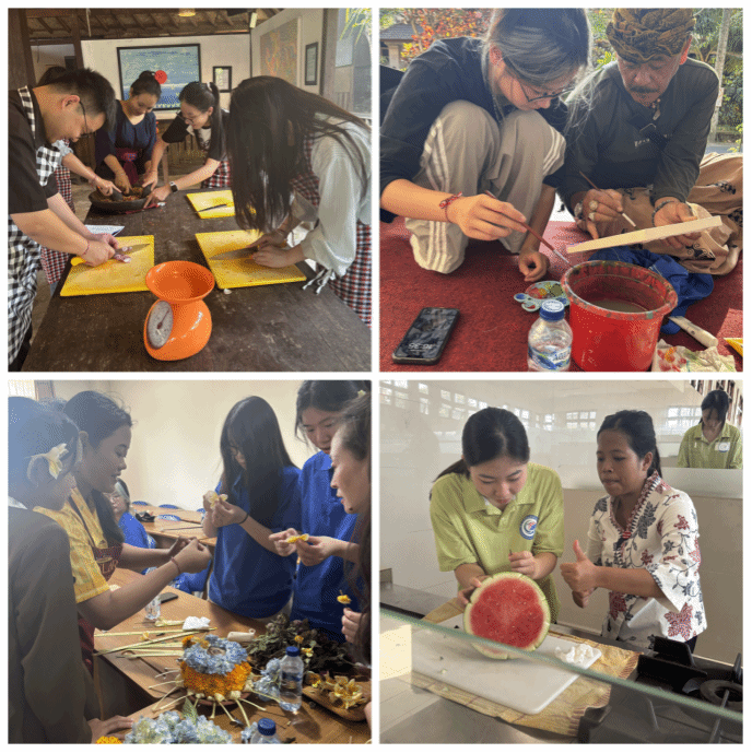 研学期间,代表团师生沉浸于巴厘旅游理工学院独具特色的“实践嵌入课程”职教模式。从基础的印尼语问候到传统的巴厘岛美食制作,从精妙的水果雕刻技艺到浓郁的本地咖啡冲泡,每一门技能课程都是一次深度体验。同学们在本地匠师的悉心指导下,不仅掌握了实用技能,更深刻感受到了印尼旅游、酒店服务行业追求卓越、精益求精的专业精神。