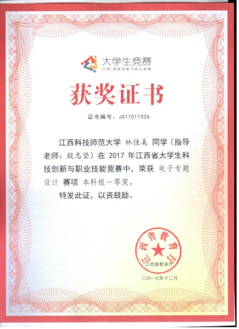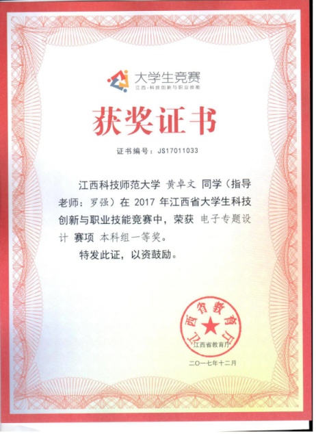 近五年来,学生积极各类竞赛,2017年全国大学生电子设计竞赛中获国家级一等奖3项、二等奖3项,全国排名19位;2019年在该项竞赛中获国家级一等奖3项、二等奖5项,全国排名19位;2021年在该项竞赛中获国家级二等奖4项;2023年在该项竞赛中获得国家级一等奖5项。在2023年中国机器人及人工智能大赛中获国家级一等奖1项、二等奖1项。同时,学生积极参加江西省大学生电子综合设计竞赛、江西省大学生电子专题设计(现场设计)、江西省大学生电子专题设计(仿真设计)、全国大学生智能汽车竞赛、“西门子杯”中国智能制造挑战赛等,近五年获赛区级二等奖2项,省级特等奖2项,省级一等奖88项,省级二等奖105项和省级三等奖81项。