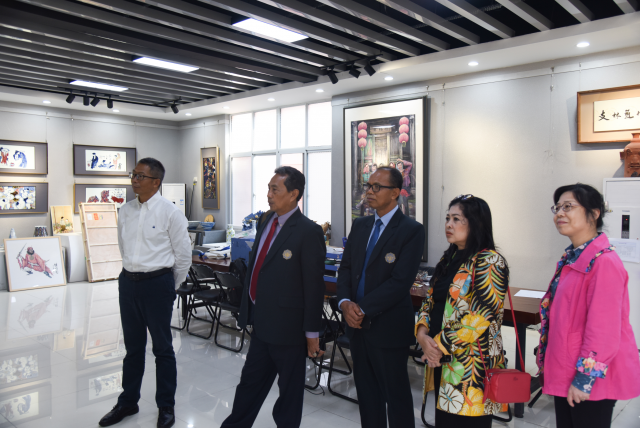 会前,郑鹏武陪同来宾一行参观了大国工匠、学校美术学院支林教授工作画室、旅游与历史文化学院智慧旅游实训中心,并和旅游与历史文化学院师生进行了交流。