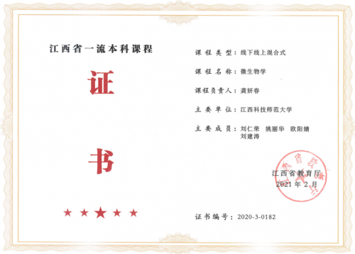 课程建设方面:龚妍春老师团队的《微生物学》课程获批国家一流本科课程。龚妍春老师获江西省金牌教师称号。在2021年度校级“课程思政”示范课程建设中,学院教师获立项8项。近5年获批省级精品课程、在线开放性课程、一流课程等4项,获批省级教改课题18项。