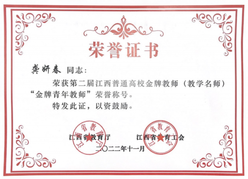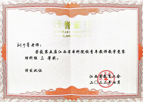 教学竞赛方面。2022年,学院刘少芳老师获“第五届江西省本科院校青年教师教学竞赛”三等奖。在学校2022年教师教学创新大赛中,学院龚妍春老师荣获特等奖,刘少芳老师荣获一等奖,李金枝老师荣获二等奖。
