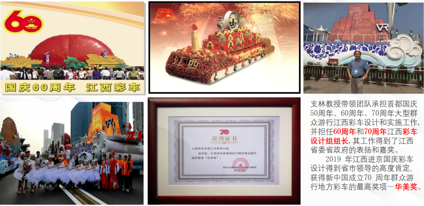 秉承艺科融合的理念,学科团队承担首都国庆50周年、60周年大型群众游行江西彩车设计和实施工作,并担任60周年和70周年江西彩车设计组组长,得到了江西省委、省政府的表扬和嘉奖,被评为荣获首都庆祝中华人民共和国成立 60 周年游行活动突出贡献专家,70 周年群众游行地方彩车的最高奖项——“华美奖”。