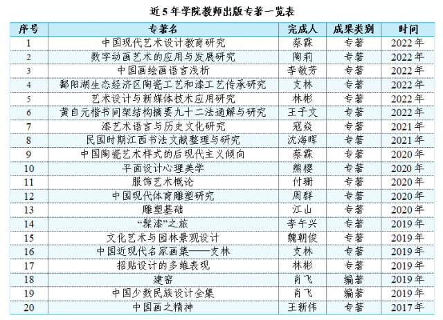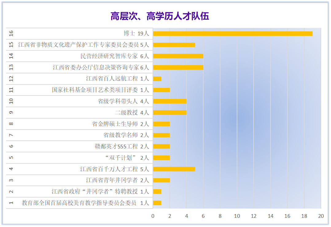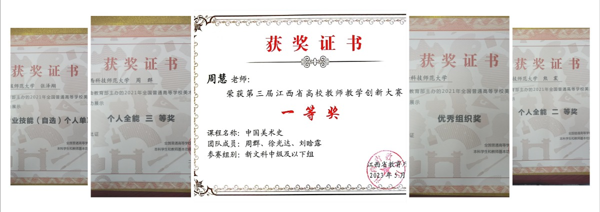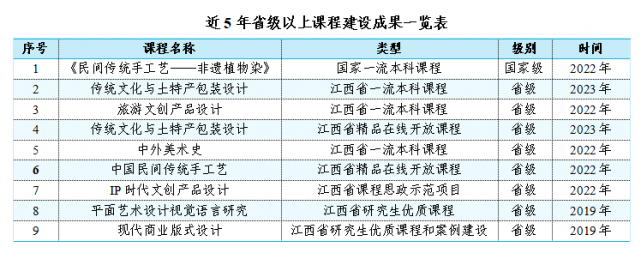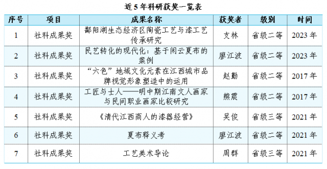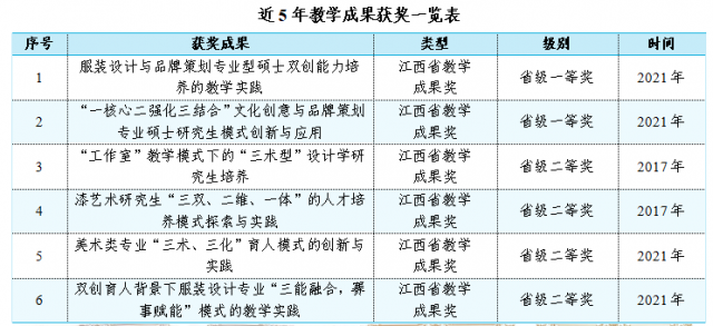 名师团队育人增实效。学院以骨干教师为引领、以平台为支撑,加强教学团队建设,培育教学名师,引领教学创新发展。学院现拥有2支江西省名师工作室团队、2支江西省高水平本科教学团队、2名“金牌研究生导师”、2名“省级教学名师”,团队教师获国家及省级教学比赛8项。此外,学院还拥有江西省非物质文化遗产研究基地以及江西省社科重点研究基地“传统工艺与非遗研究中心”2个省级教学科研平台。