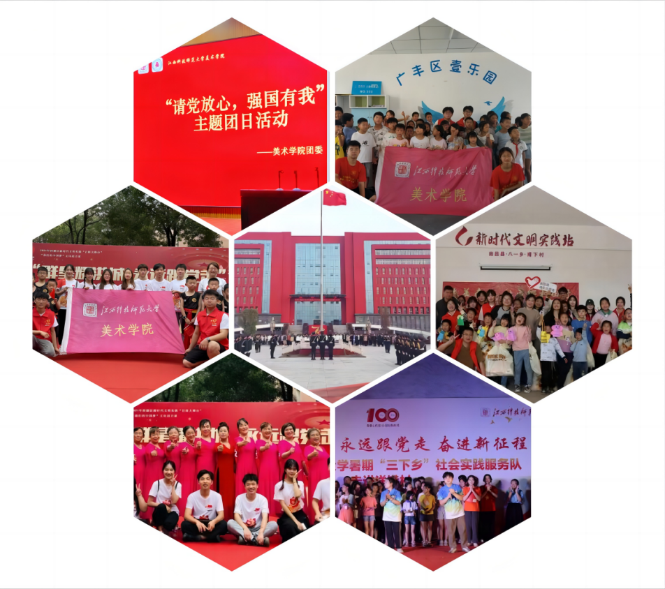 团学活动焕发“活力”。通过建立“一个”制度保证体制,结合艺术专业开展“十”余个志愿服务重点项目,规划建设“百”个校地志愿服务实践地, 近“千”余人次学生积极参与志愿活动, 每年志愿服务影响覆盖“万”人,持续开展“个十百千万”计划,共青团的引领力、组织力、服务力不断加强,团组织焕发出更多的青春活力。学习强国、中国青年网、今视频、文明江西、江西青年志愿者官媒、江西教育厅官媒等媒体报道学院实践育人成果,连续2年在“寻找全国大学生百强暑期社会实践团队”平台展示,实践成果连续两年获江西省模拟政协“三等奖”,获江西省三下乡优秀个人等省级荣誉32项、市厅级荣誉近百项。