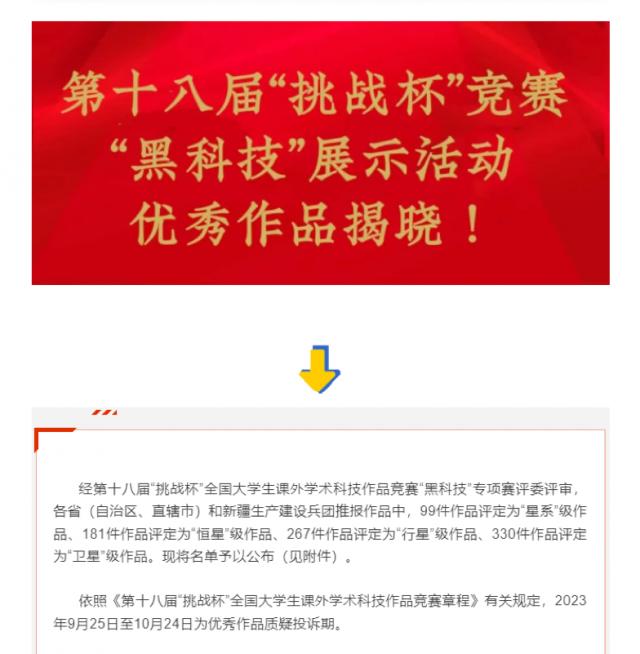 “挑战杯”全国大学生课外学术科技作品竞赛被誉为中国大学生学术科技的“奥林匹克”盛会,是目前国内大学生最关注最热门的全国性竞赛。“黑科技”专项赛,则主要征集对前沿领域和现有科技成果具有一定颠覆性、超越性、前瞻性、创新性和应用性的实物或者技术作品,培养青年科创意识和能力,以应对核心技术的“卡脖子”问题。