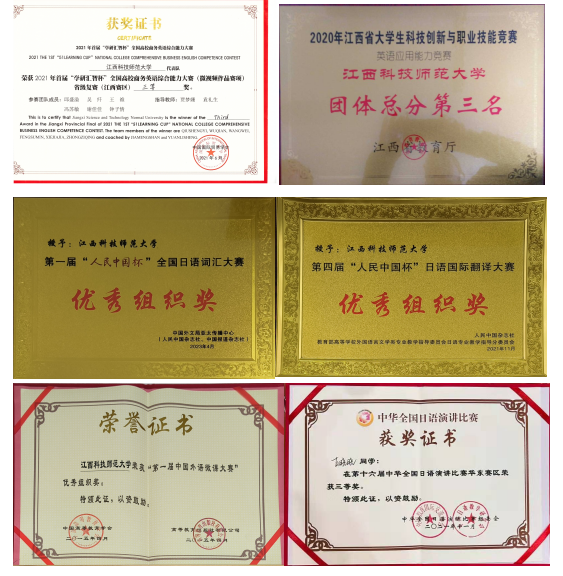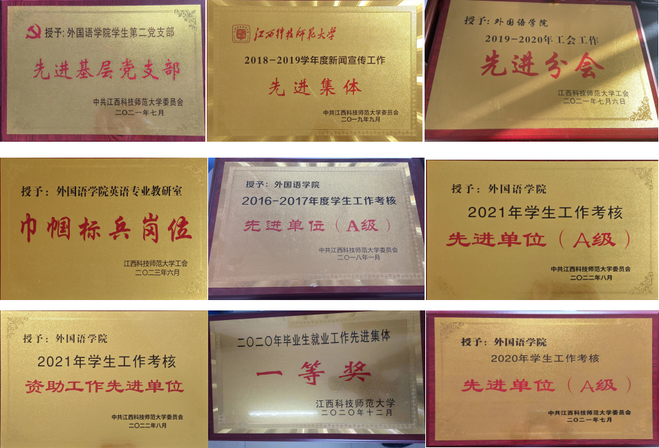 五年来,学院荣获全省高校党建工作案例二等奖,获批全省高校示范性党员活动室,先后荣获学校先进基层党组织、思想政治教育“十育人”先进集体、新闻宣传工作先进集体、“学校工会工作先进集体”、“学生工作先进单位(A级)”等荣誉。高质量党建引领事业发展成效显著:英语专业获批2021年度省级一流本科专业建设点,连续5年在全国大学生英语竞赛和赣江杯英语竞赛中获团体一、二、三等奖;获省教学成果奖9项;国家级、省部级和校级课题50余项,横向科研经费近150万元,科研成果获省部级奖5项。制定实施《外国语学院学生工作提升计划》,形成“以党建为引领、党员为关键、网格化为手段、学工干部各负其责、师生共同参与”的工作格局,推动团学工作取得新局面,学院暑期“三下乡”社会实践活动获2022年团中央“镜头中的三下乡”优秀视频团队(全校唯一),荣获“全省五四红旗团委”荣誉称号。