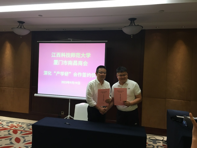 下午,左和平一行参加了江西科技师范大学与厦门市南昌商会深化产学研合作签约仪式。双方就建立实习就业基地、设立创新创业商会助力基金、设立创新创业导师、顾问团队、举办校企论坛、推动科技成果转化等方面达成了具体推进时间和具体落地内容。