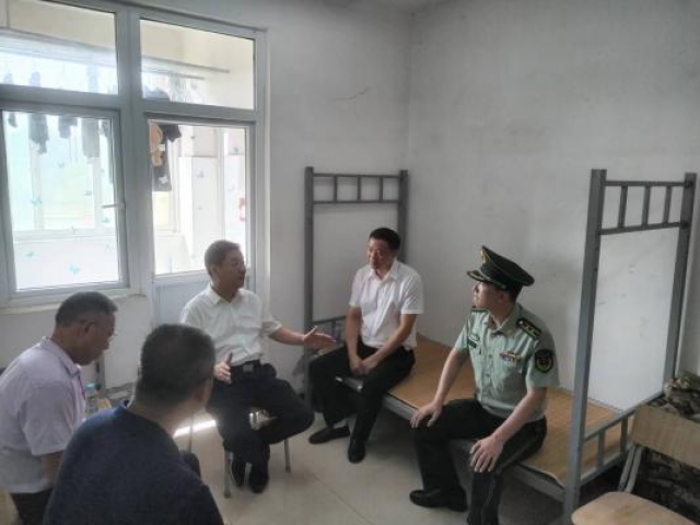 李文龙一行首先来到承训部队官兵驻地,察看驻训官兵后勤保障情况,并与承训部队负责人饶杨,就军训期间的相关工作任务、目标、要求,进行了交流和探讨。