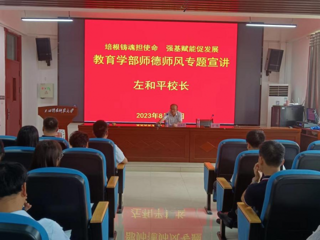 为深入学习贯彻党的二十大精神,推动主题教育走深走实,持续加强和改进新时代师德师风建设,落实立德树人根本任务,8月31日-9月1日,校长左和平为教育学部教职工和部分学生作师德师风教育专题讲座。