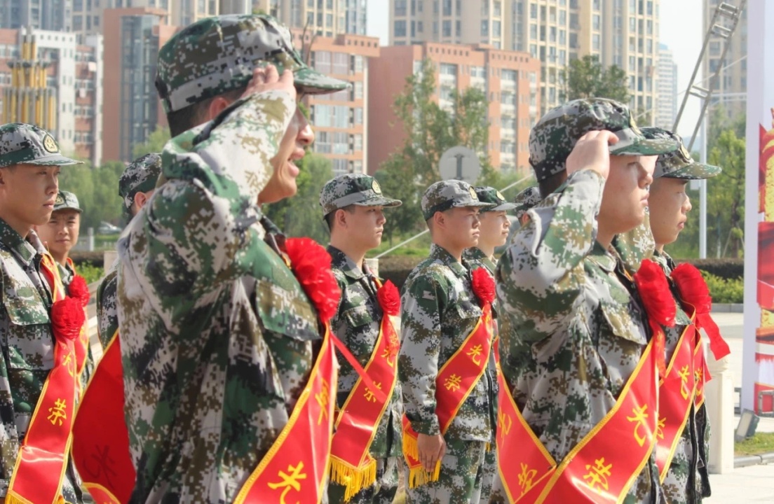 校领导依次为入伍学生披挂大红花并颁发纪念品,应征入伍学生肩披“参军光荣”绶带,胸佩大红花,身着作训服,军姿挺拔,精神抖擞。紧接着,全体应征入伍学生齐诵《军民情·七律》,“难得举城作一庆,爱我人民爱我军。”字字铿锵有力,句句掷地有声,抒发了强烈的拥军爱国之情,与会师生无不热血沸腾。