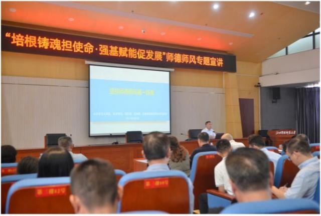 9月2日上午,校党委副书记刘国云在红角洲校区图书馆950会议室作“培根铸魂担使命,强基赋能促发展”师德师风专题宣讲,马克思主义学院、美术学院、党委组织部、党委宣传部、党委统战部全体干部职工共200余人聆听了宣讲。