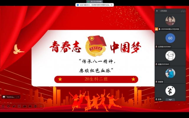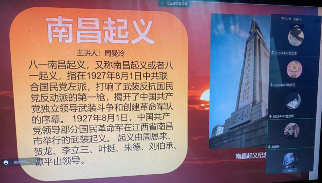 开展“赓续红色血脉传承八一精神”线上主题团日活动。八一恰逢暑假,为引导学生弘扬优秀革命传统,传承红色基因,做到停课不停学,我校组织全校班级团支部开展了“赓续红色血脉传承八一精神”线上主题团日活动。各团支部结合班级实际、专业特色,积极开展各类形式丰富的活动,如线上集中观看阅兵仪式、红色电影“云”观看、八一精神主题宣讲、线上分享交流会等,为八一建军节献上祝贺,向最可爱的中国人民解放军致敬。通过这次团日活动,同学们进一步坚定了“红色信仰”,纷纷表示要自觉传承“八一精神”,从党的建军历史中汲取力量,牢记使命,继先辈之薪火,敢为人先,开拓创新,为实现中华民族伟大复兴中国梦贡献更大力量。