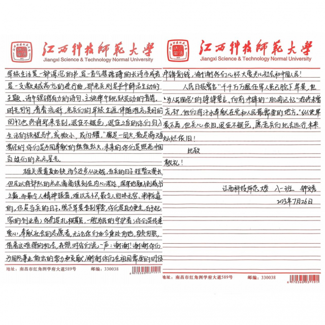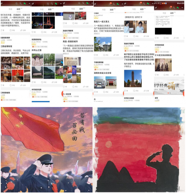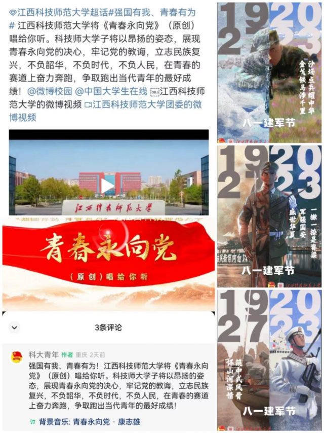 推出一系列新媒体宣传报道。2023年7月20日至8月1日,校团委以“赓续红色血脉传承八一精神”为主题进行线上平台宣传,推出:“TA们!如此闪耀!”建军节系列推文(以“爱国”“爱军”为主旋律,通过“回顾建军历史”、“分享军人故事”、“军事科技新进展”三个方面入手,弘扬军人精神,讲述军人故事);“赓续红色血脉传承八一精神”专题原创海报展示(致敬感动中国人物中的军人);科技师大青年学党史;党史百年天天读;回望历史:南昌起义故事;军人影视作品混剪等,进一步浓厚八一建军节氛围,引导广大青年切实肩负起新时代新征程党赋予的使命任务,在中国式现代化建设中挺膺担当,为推进强国建设、复兴伟业接续奋斗!