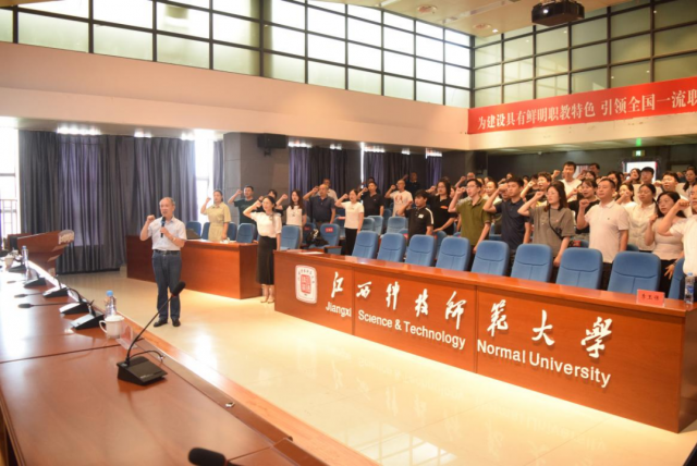 “我志愿成为一名高校辅导员,拥护党的领导,献身教育事业,恪守职业规范,提升专业素养,情系学生成长,做好良师益友,为培养社会主义合格建设者和可靠接班人而努力奋斗!”在大连海事大学曲建武教授带领下,江西科技师范大学2023年暑期“三联三融”合作院校辅导员主题教育培训班全体学员铿锵有力的声音回响会议大厅。