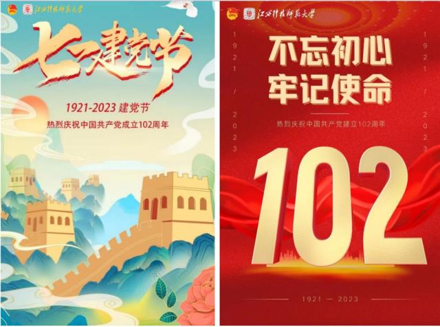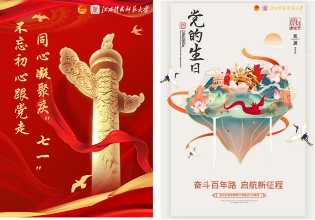 通过海报展示,以丰富的色彩和线条高度凝练“不忘初心跟党走,同心凝聚庆‘七一’”内涵,具象化地表达师生迎接“七一”建党节的喜悦之情。以文案海报彰显伟大建党精神,号召青年大学生不忘来时路,初心敬党心,将爱国主义精神内化于心、外化于行。