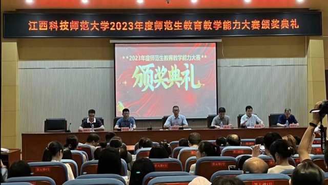 6月11日下午,由教务处主办,教育学部承办的我校2023年度师范生教育教学能力大赛颁奖典礼在图书馆950会议室举行。校党委委员、副校长郑鹏武,教务处处长周叶,职教研究院院长闵学良,教育学部主任欧阳忠明,教务处副处长朱五福,各学院分管领导、指导教师代表、参赛学生140余人出席会议,会议由朱五福主持。