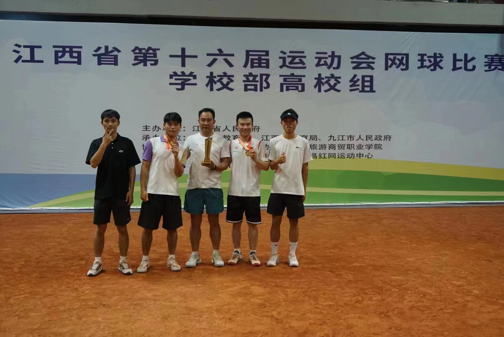 2022年11月6日-12日,江西省第十六届运动会高校部网球(乙组)比赛在南昌市中昌红网运动中心举行,我校网球队在杜进荣老师的带领下,充分发挥队员的特点和优势,最终获得男子双打、男子单打两枚金牌以及男子团体银牌,该成绩也创造了校网队参加省运会的最佳战绩!在此次比赛中,陈金万同学实力超强,包揽男子单、双打冠军。