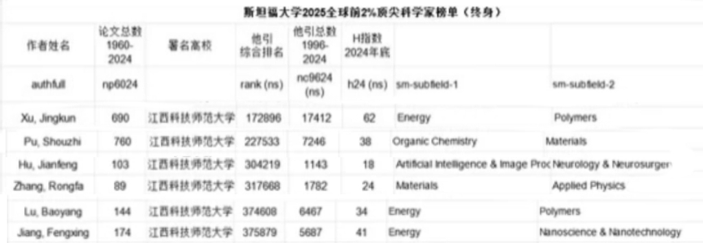 当地时间9月19日,斯坦福大学(Stanford University)和国际权威学术出版社爱思唯尔(Elsevier)共同发布2025年全球前2%顶尖科学家榜单(World's Top 2% Scientists),我校徐景坤教授、蒲守智教授、张荣发教授、蒋丰兴教授、卢宝阳教授、胡剑峰教授等6位教师入选终身科学影响力榜单,入选人数全省高校中排名第5。