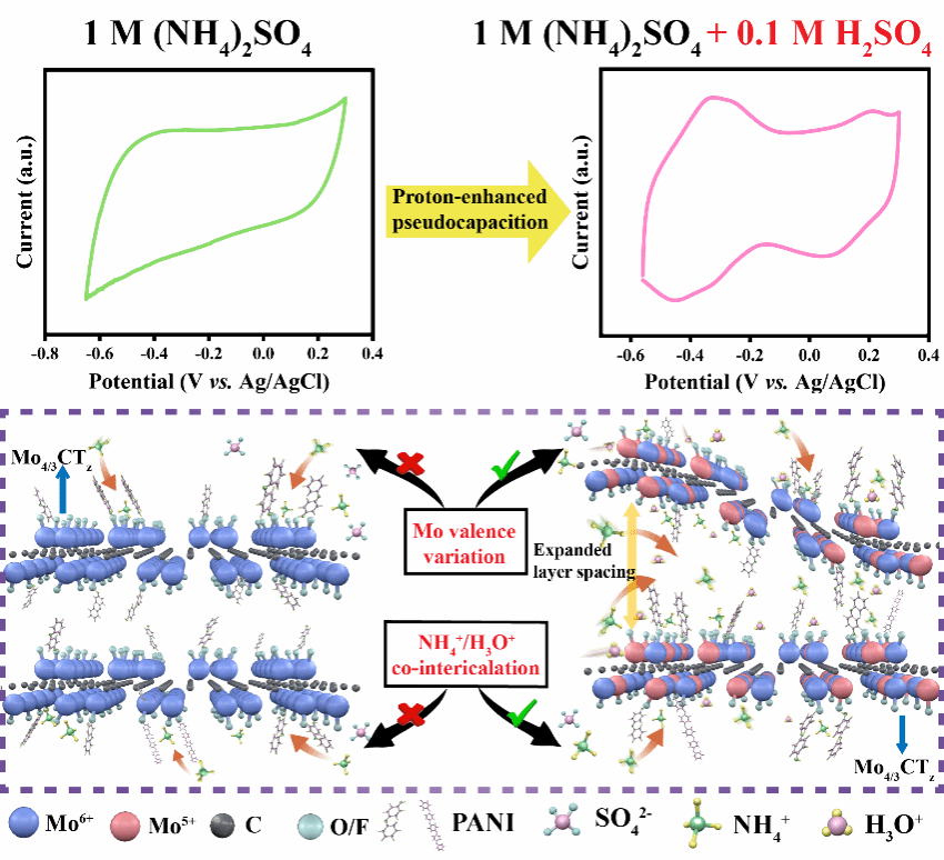 该研究设计并构建了一种基于金属空位MXene(Mo4/3CTz)与聚苯胺(PANI)复合的高性能质子调控型铵离子储能材料Mo₄/₃CTₓ/PANI,通过质子增强的离子存储机制,为推进MXene基电极设计提供了一种创新策略,为高性能AAIBs的发展开辟了新路径。