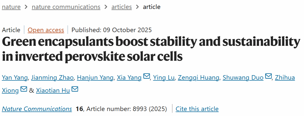 近日,先进电子材料与器件江西省重点实验室杨霞博士课题组在国际知名期刊《Nature Communications》上发表题为“Green encapsulants boost stability and sustainability in inverted perovskite solar cells”的最新研究成果。