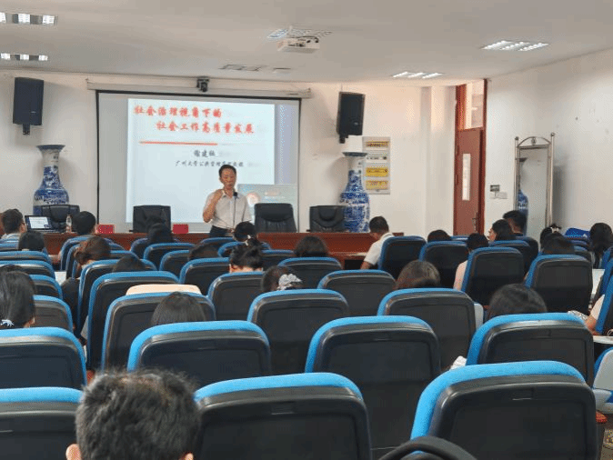 下午,在新文科楼W2317教室,谢建社教授以“社会治理视角下的社会工作高质量发展”为题开讲。他结合当前我国社会治理的新形势与新需求,围绕“社会治理的中国内涵”“社会治理的中国历史”“社会治理与社会工作”“社会工作的高质量发展”四个方面,从理论到经验、从历史到现实、从中国到外国、从政策到实践,系统阐释了社会工作在推进国家治理体系和治理能力现代化中的重要作用。他从自身主持的 “新时代城乡社区治理体系建设研究”等国家级课题出发,结合广州等地的社会工作实践案例,深入分析了当前社会工作高质量发展的核心要素、现实挑战与优化路径。