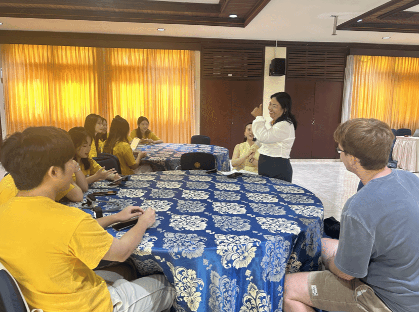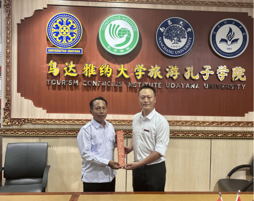 10月12日与14日,研学团先后走访了乌达雅纳大学旅游孔子学院与巴陵康孔子学院,了解了乌达雅纳大学开设的“旅游汉语”“酒店服务汉语”等特色课程以及巴陵康孔子学院在汉语教学与文化融合方面的创新实践。大家围绕“华裔身份认同”“非师范专业任教前景”等话题踊跃提问,拓宽了职业视野。座谈后,刘伟向院方赠送了我校王子文博士书法美育名师工作室的书法作品,表达友好情谊。