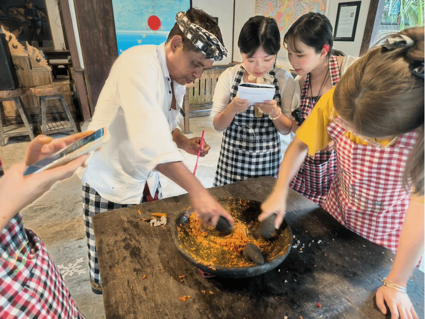 在印尼语言课堂上,经验丰富的Bubas老师通过情景模拟与互动问答形式,帮助研学成员迅速掌握日常用语,扫除沟通障碍。巴厘岛传统插花课程也同步展开,专业花艺师系统讲解了当地插花艺术的选材、构图与象征意义,印尼学生热情分享创作心得,并手把手指导研学成员完成花艺作品。在轻松愉悦的协作氛围中,每位成员都创作出独具个人风格的作品。
