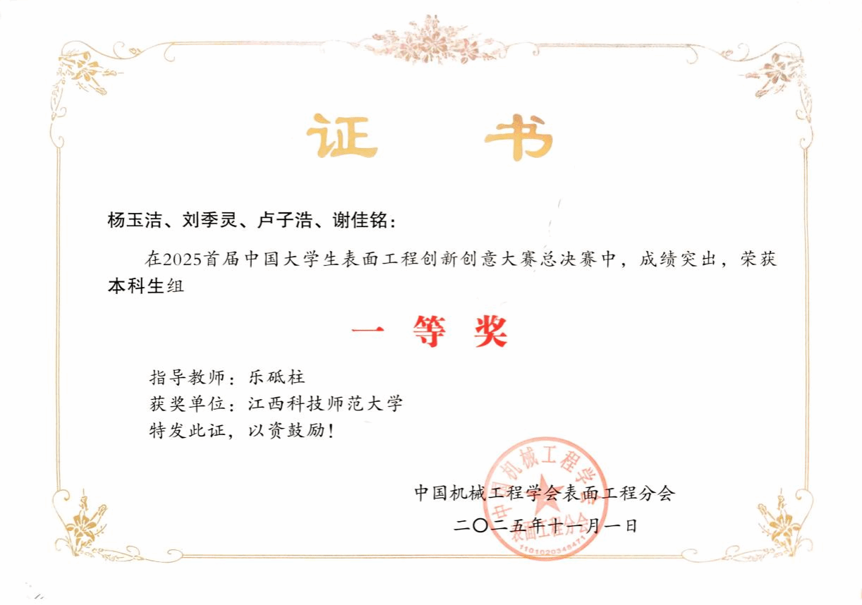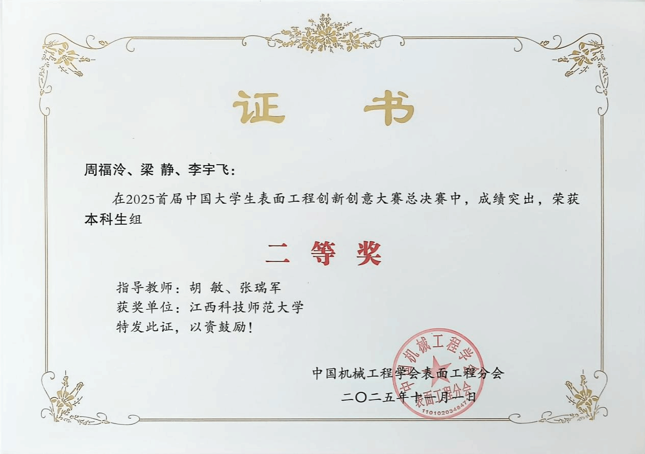据悉,表面工程创新创意大赛是由中国机械工程协会表面工程分会主办的表面工程领域学科竞赛,旨在激发学生的创新思维,提升科研与实践能力。来自北京大学、国防科技大学、浙江大学等在内的上百所高校报名参加本届大赛,经过层层选拔,49支研究生和33支本科生代表队进入总决赛。我校材料与能源学院教师乐砥柱博士指导,本科生杨玉洁、谢佳铭、卢子浩、刘季灵组成的代表队荣获全国一等奖;由人工智能学院老师胡敏、张瑞军博士指导,本科生周福冷、梁静、李宇飞组成的代表队荣获全国二等奖。