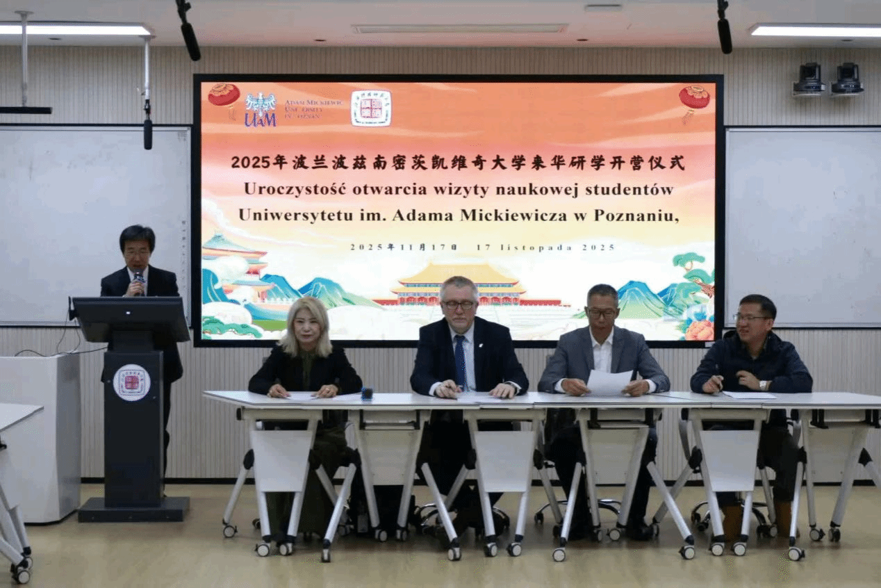11月17日上午,2025年波兹南密茨凯维奇大学来华研学开营仪式在我校红角洲校区W1409教室举行。波兹南密茨凯维奇大学副校长拉法尔·维特科夫斯基(Rafał Witkowski)、我校副校长郑鹏武出席。
