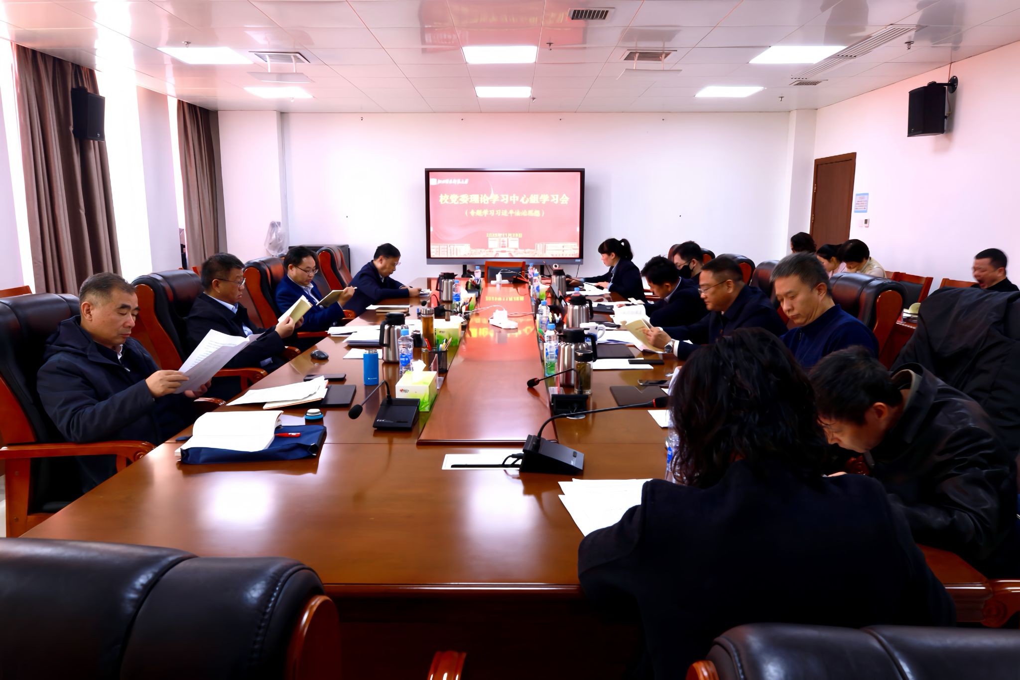 11月28日下午,学校在红角洲校区图书馆第一会议室召开校党委理论学习中心组专题学习会,学习习近平法治思想。校党委书记裴鸿卫主持。校党委理论学习中心组成员参加。