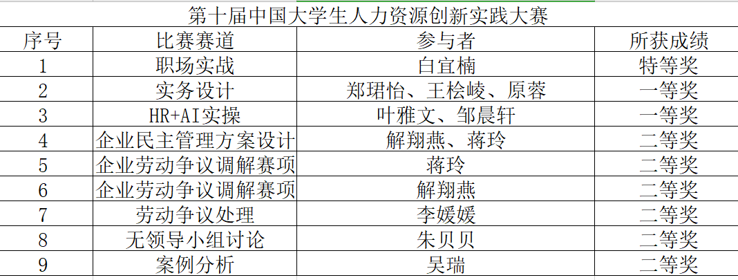 近日,第十届中国大学生人力资源创新实践大赛全国总决赛在北京落幕,我校代表队获大面积丰收,勇夺特等奖1项、一等奖2项、二等奖4项,并获全国团体二等奖。