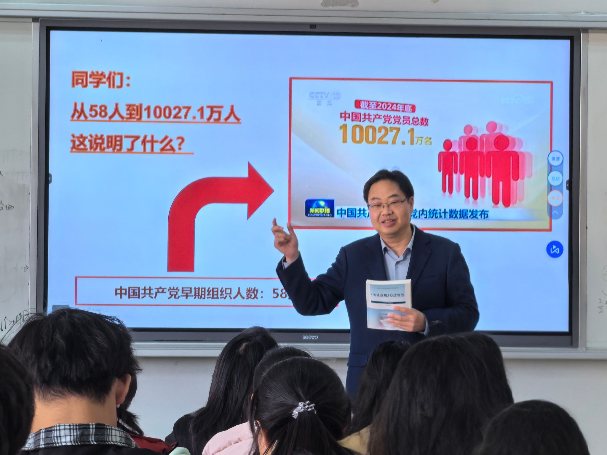 12月11日上午,校党委副书记、校长袁雄深入3栋教学楼3307教室,全程旁听马克思主义学院王珍老师为2025级人工智能1班、2025级智能感知工程1班讲授的《中国近现代史纲要》第六专题“中国人民有了主心骨”课程。课后,袁雄紧扣课程主题与学生即兴交流,以“把厚书读薄、把薄书读厚”的治学方法为核心,引导青年学子从历史中汲取奋进力量。