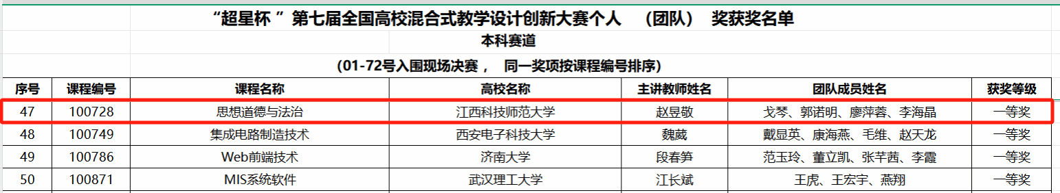 “超星杯”全国高校混合式教学设计创新大赛旨在推动高校教师开展混合式教学改革与课程建设创新。本届大赛吸引全国551所高校参与,覆盖全部学科门类。经层层选拔,499所高校的1362门课程晋级全国复赛,最终77所高校的82门课程入围现场决赛。赵昱敬团队主讲的《思想道德与法治》课程是本届比赛中唯一的思政类参赛课程,凸显了学校在思政课教学改革方面的显著成效。