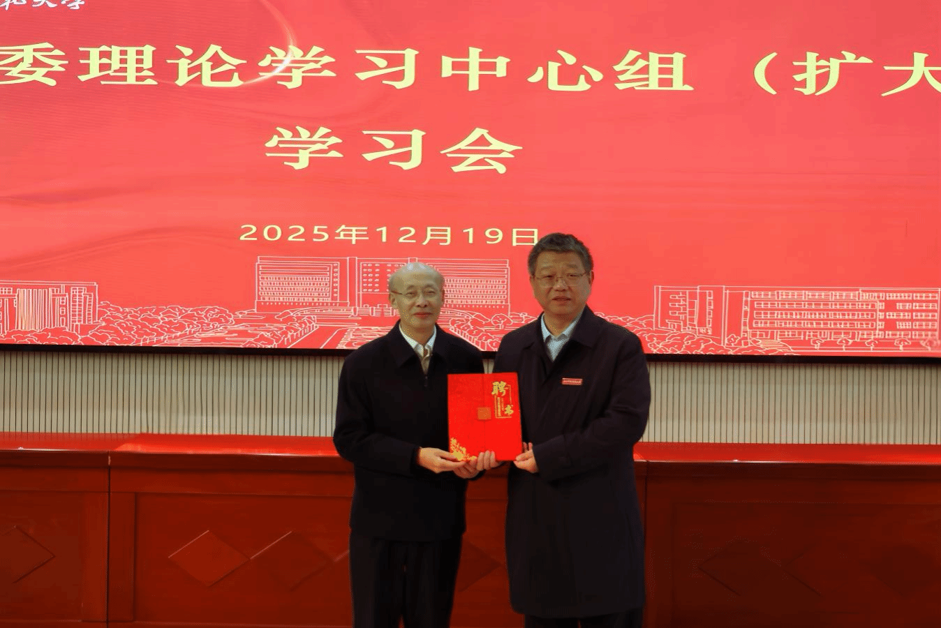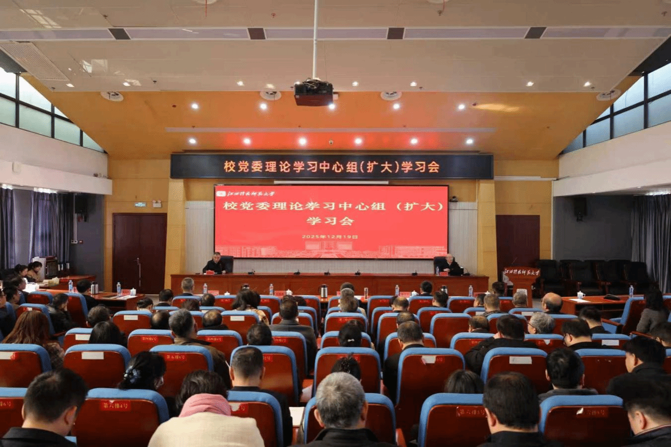 12 月 19 日上午,学校在红角洲校区图书馆学术报告厅召开校党委理论学习中心组(扩大)学习会。会议聚焦学习贯彻党的二十届四中全会精神,深刻领悟习近平文化思想核心要义。中国传媒大学资深教授、中央政治局集体学习主讲专家、我校杰出校友熊澄宇受邀作“文化推进文明、传播决定传承——学习党的二十届四中全会关于文化强国战略的思考”专题辅导报告。校党委书记裴鸿卫为熊澄宇颁发讲席教授聘书。江西中医药大学党委宣传部副部长刘婷列席旁听。