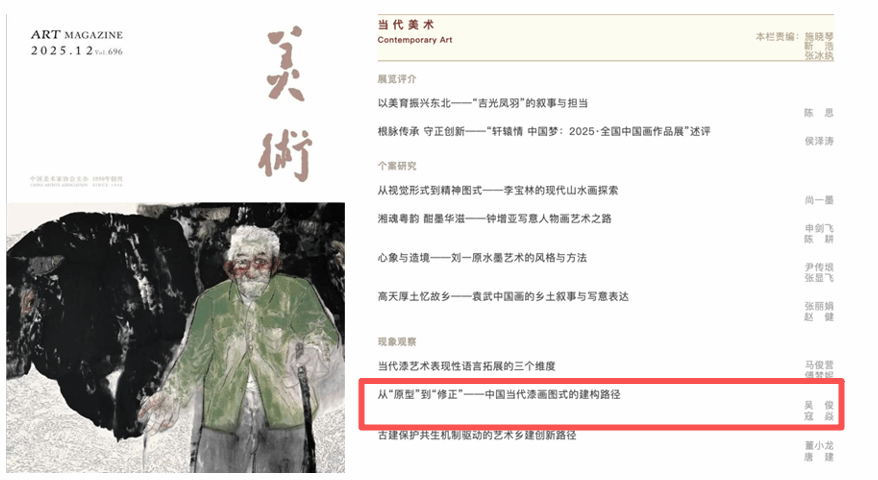 近日,美术学院吴俊副教授(校聘)与寇焱教授合作撰写的学术论文《从“原型”到“修正”——中国当代漆画图式的建构路径》在艺术类顶级学术期刊《美术》2025年第12期上发表。