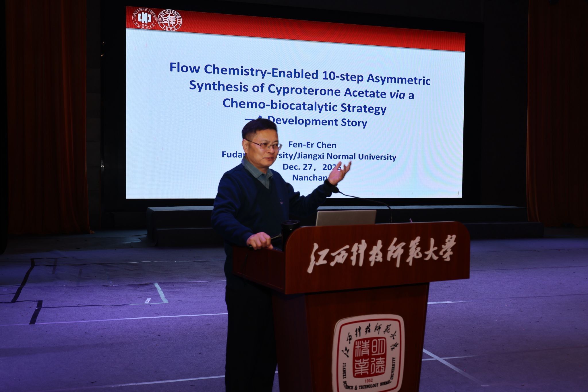 是日上午,论坛第一阶段的报告会在红角洲校区红五星报告厅举行。陈芬儿院士以“Flow Chemistry-Enabled 10-step Asymmetric Synthesis of Cyproterone Acetate via a Chemo-biocatalytic Strategy—A Development Story(流动化学助力的10步不对称合成醋酸环丙孕酮:一种化学生物催化策略的研发历程)”为题,系统阐述了醋酸环丙孕酮传统合成工艺在步骤冗长、效率较低及安全性不足等方面的局限。他指出,团队通过引入连续流合成平台,并结合化学催化与生物催化协同策略,成功将醋酸环丙孕酮的合成路径优化至仅10步,显著提升了合成效率与过程绿色化水平。该研究充分发挥了连续流技术反应时间短、过程控制精准等优势,为复杂药物分子的工业化合成提供了创新思路。此外,陈芬儿院士还系统介绍了流动化学的基本原理、在药物合成中的应用潜力及其技术特点,并通过关键指标对比,凸显出全连续流工艺在安全性、环保性与合成效率方面的综合优势,进一步印证了连续流合成作为新一代化工生产技术的广阔发展前景。校长袁雄主持报告会。