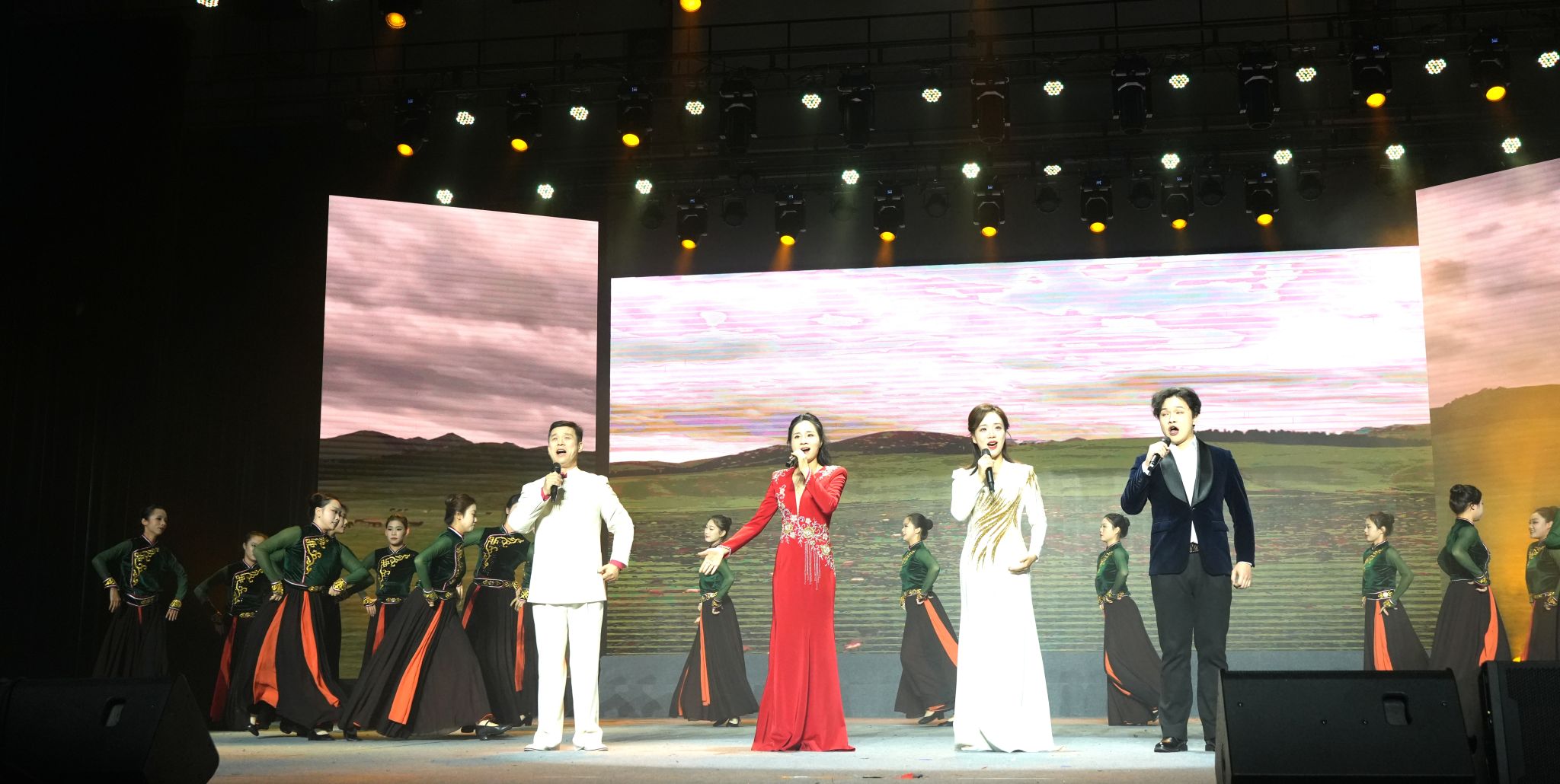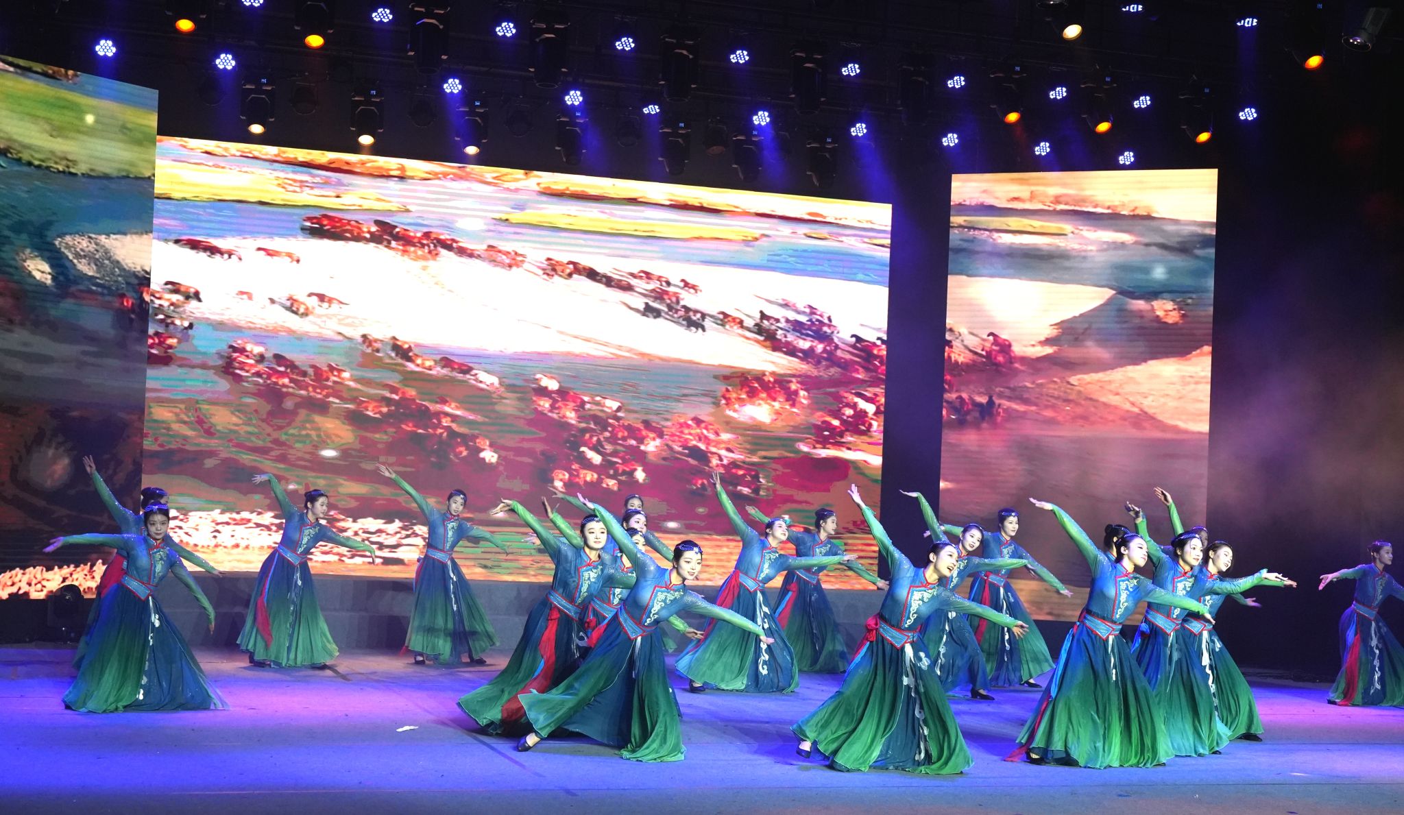 晚会共分为四个篇章,以激昂的民乐合奏《骏腾岁首·迎新纳福》拉开序幕,《万马奔腾贺新春》等经典曲目瞬间点燃了现场气氛。第一篇章“马跃山河·奋进之歌”中,音乐学院带来的《红色交响曲》气势恢宏,幼儿园的舞蹈《星星在说话》活泼可爱、充满童趣,男女声歌曲联唱《马儿的故事》由曲目《马铃儿响来玉鸟儿唱》《马儿你慢些走》《骏马奔腾保边疆》组成,旋律悠扬。女子舞蹈《赞歌》舞姿优美,以游牧民族风情,展现了骏马秋风、长河落日的诗画意境。