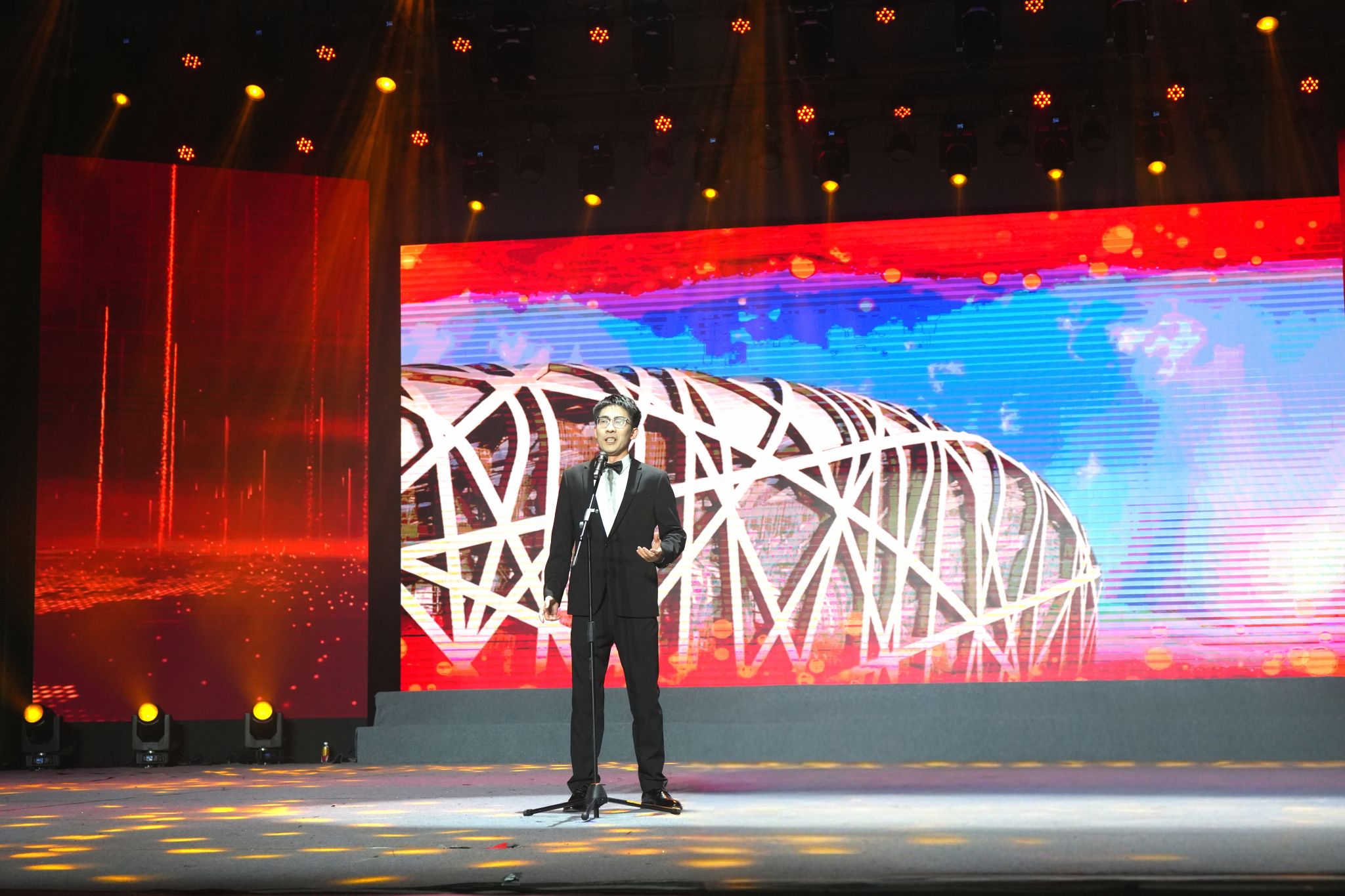 第三篇章“万马奔腾·智启未来”将晚会推向高潮。女团唱跳的网红歌曲与舞蹈串烧《三彩》充满青春动感,离退休办的朗诵《老有老的骄傲》深情款款,《珊瑚颂》《你》《青花瓷》《明天会更好》等老歌回响环节带领大家重温经典,唱出了对未来的美好期盼。音乐学院陈泽文老师演唱的《把一切献给党》深情而坚定,表达了师生们赤诚的信仰与情怀。