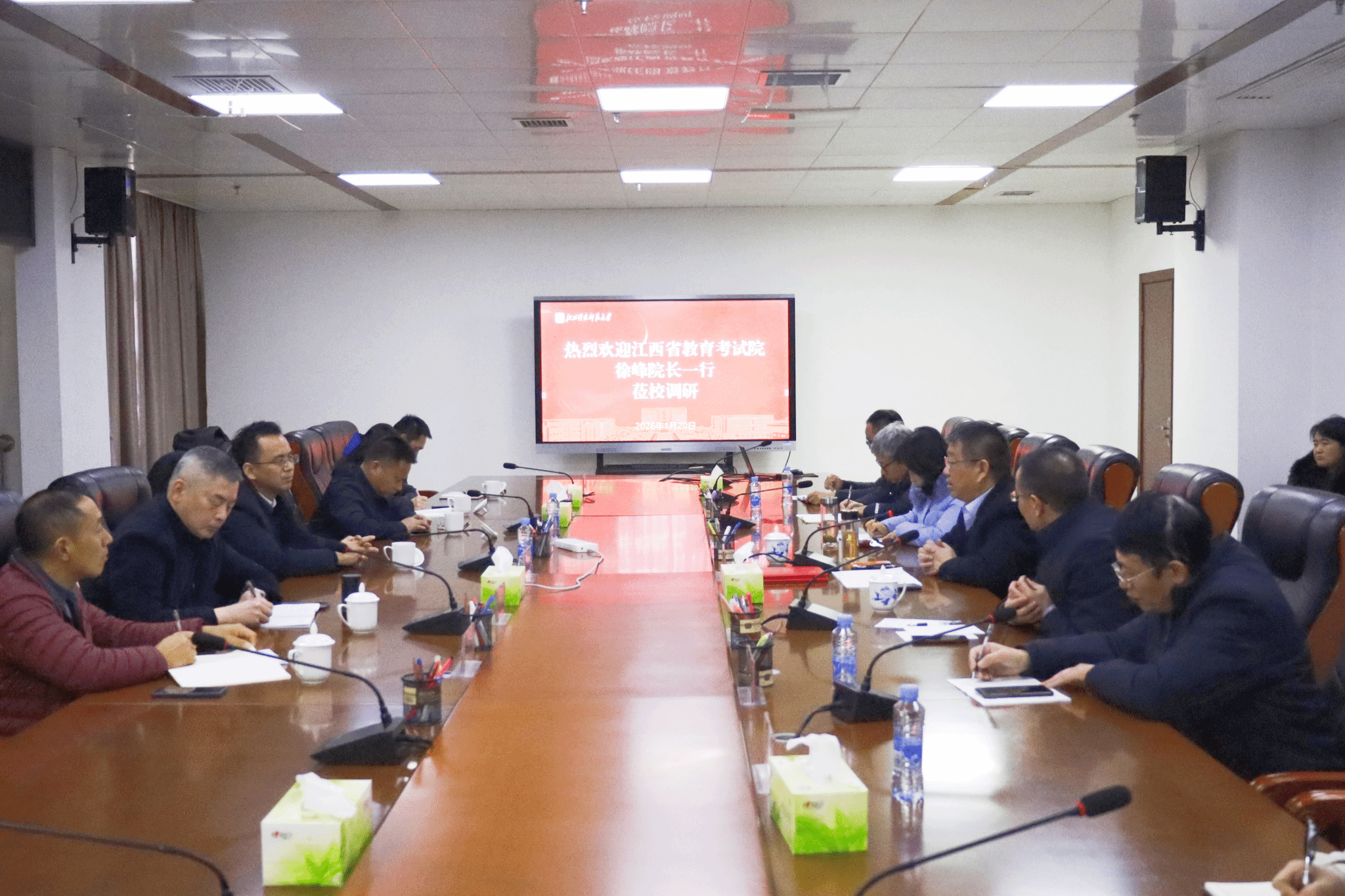 1月20日上午,江西省考试院院长徐峰、副院长熊礼淼一行6人来校,就体育统考场馆建设及教育考试相关工作开展专题调研。校党委书记裴鸿卫、副校长裘指挥出席座谈会。