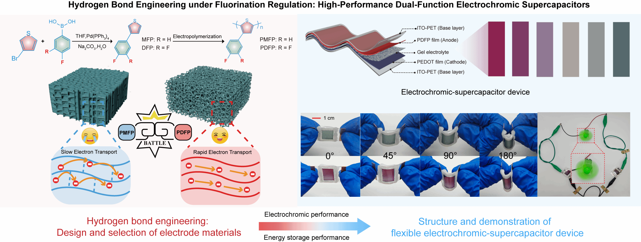 针对上述挑战,张革副教授、黄瑶博士团队创新性地提出了分子氟化与氢键工程协同策略。通过设计氟化噻吩单体并利用双氟化调控聚合物链间氢键网络,成功构建了连续互穿的三维多孔导电结构。该结构显著增强了材料电子/离子传输能力与结构稳定性,实现了高能量存储与大光学对比度的协同优化,并基于此开发出性能稳定的柔性电致变色-超级电容器,为高性能器件开发提供了有效的材料设计策略。