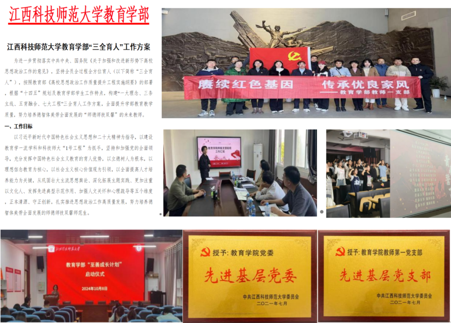 教育学部党委持续深化党建引领,打造“红烛”党建品牌,构建了“铸师魂、强师范、育未来”的特色思政工作体系,对接服务学校“教师教育”第一职责和“职教师资培养”办学特色,确立了“立足师范、服务职教”的发展方向,构建起涵盖基础教育、职业教育、教师教育的“全链条”育人体系,成为全校唯一一个拥有2个国家级教学平台和4个省部级研究平台。获国家级一流专业、一流课程及多项省部级重要奖项;教师队伍中涌现出国务院政府特殊津贴专家、全国自强模范、中宣部“四个一批”人才工程,省“双千计划”人才、省百千万人才工程人才、青年井冈学者等优秀典型。学生在全国竞赛中屡获佳绩,培养质量与社会声誉持续提升。
