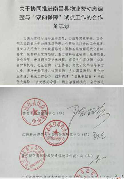 为贯彻落实省领导批示精神,推动调研成果从“纸上”落到“地上”,课题组率先在南昌县开展试点。近日,南昌县住房保障中心、我校国际仲裁研究中心、江西省法学会仲裁法学研究会物业纠纷化解服务站、南昌县物业管理行业协会等六家单位共同签署合作备忘录,携手推动报告所提方案的实施,旨在形成一套可复制、可推广的县域物业纠纷协同治理“江西样板”。