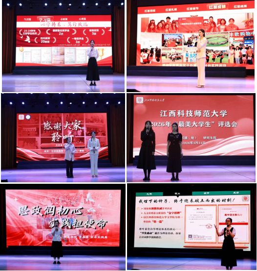 评选会上,候选人依次登台,通过PPT、短视频及指导老师陈述等形式,全方位展现成长历程与突出事迹。他们中,有逆境中自强不息的励志榜样,有带父上学孝老爱亲的道德典范,有科研路上孜孜以求的科创达人,有扎根基层服务社会的公益先锋,也有传承中华传统美德的美德青年。选手们有的以“追光而行 向光而长”为题讲述从迷茫到坚定的蜕变,有的以“绽放青春 逐梦韶华”为题传递体育人的拼搏热情,有的以“思政润初心 实践担使命”诠释理论联系实际的青春担当,有的以“我在科技师大种了一棵树”为题生动呈现全面发展的轨迹……一个个真实感人的故事,一句句发自肺腑的誓言,赢得现场阵阵掌声。经过近三小时的激烈角逐,侯含睿等10名同学获评“最美大学生”,袁嘉惠等10名同学获“最美大学生提名”。