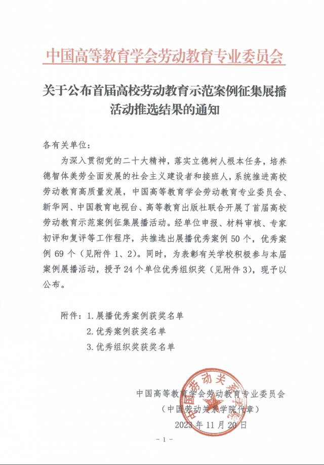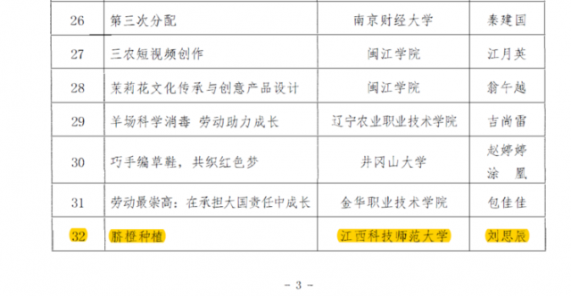 近日,由中国高等教育学会劳动教育专业委员会、新华网、中国教育电视台、高等教育出版社联合开展的“以劳树德以劳启智”首届高校劳动教育示范案例征集展播活动推选结果公布,由学校教务处牵头,联合校团委、学生工作处和创新创业学院等部门组织申报的《脐橙种植》(刘思辰主讲)和《劳动教育与双创教育》(程婷立主讲)两个劳动教育课程案例分别入选展播优秀案例和优秀案例,学校同时荣获优秀组织奖。