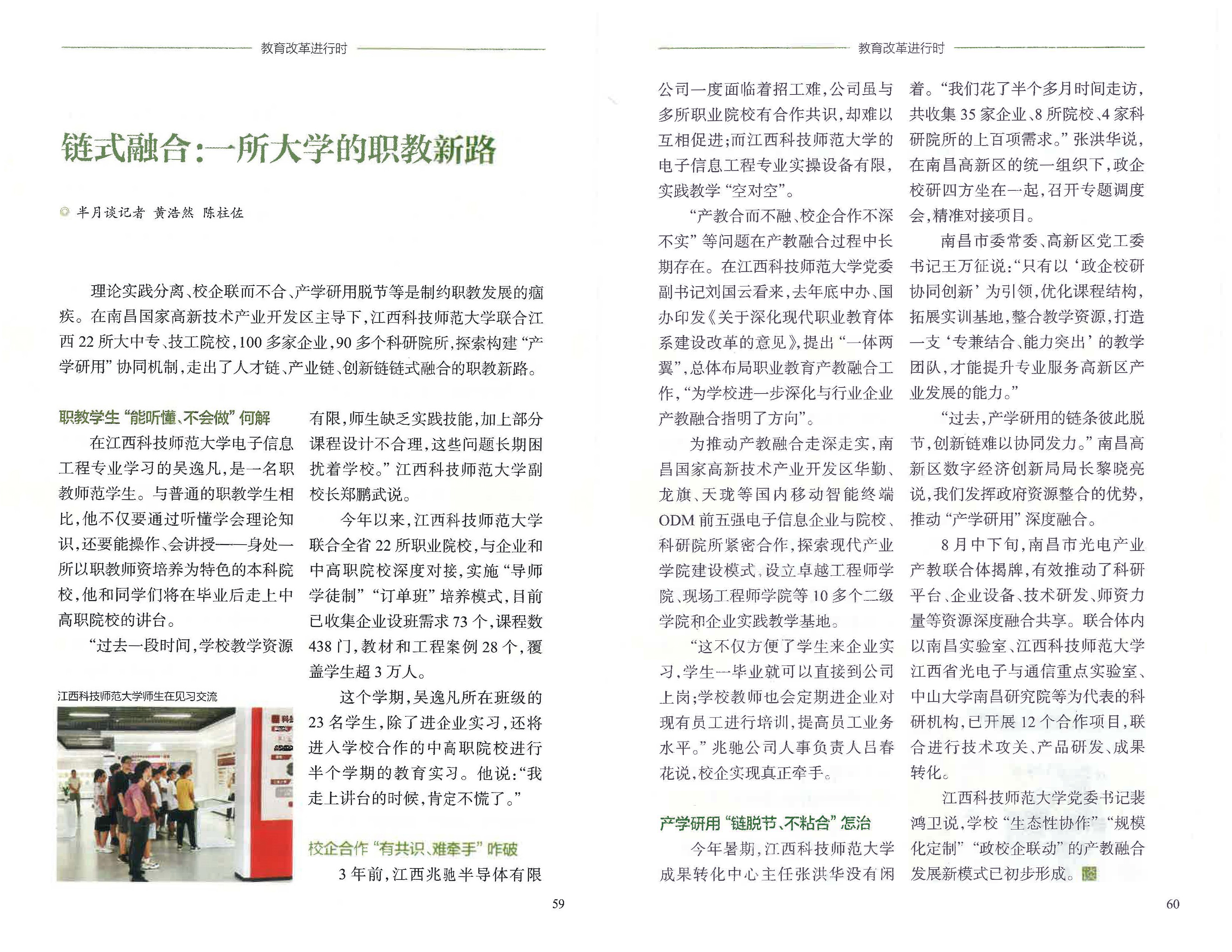 11月10日,由中共中央宣传部委托新华社主办的重要党刊《半月谈》,在2023年第21期“教育改革进行时”栏目刊发了文章《链式融合:一所大学的职教新路》报道我校探索构建产学研用协同机制,走出人才链、产业链、创新链链式融合的职教新路。全文如下。