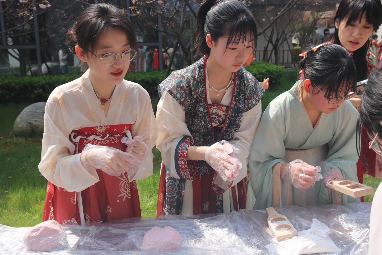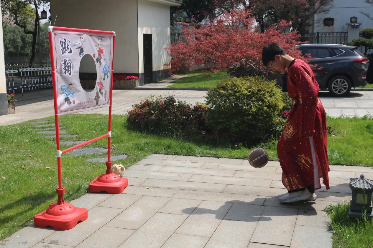 现场还安排了自由体验DIY樱花糕点、蹴鞠、投壶、挂红等多种富有趣味性的文化体验活动。中日学生们在盛开的樱花树下畅谈游玩,积极交流,其乐融融的景象与满园的春色相映成趣。